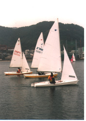 ↑ヨット部のスナイプ(奥の2隻) と帆走中のNAMI-K号、クルー は岩本君、小生(野瀬) |
